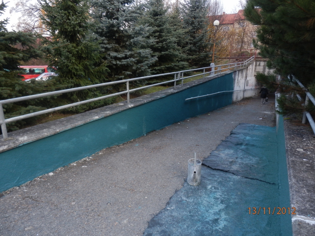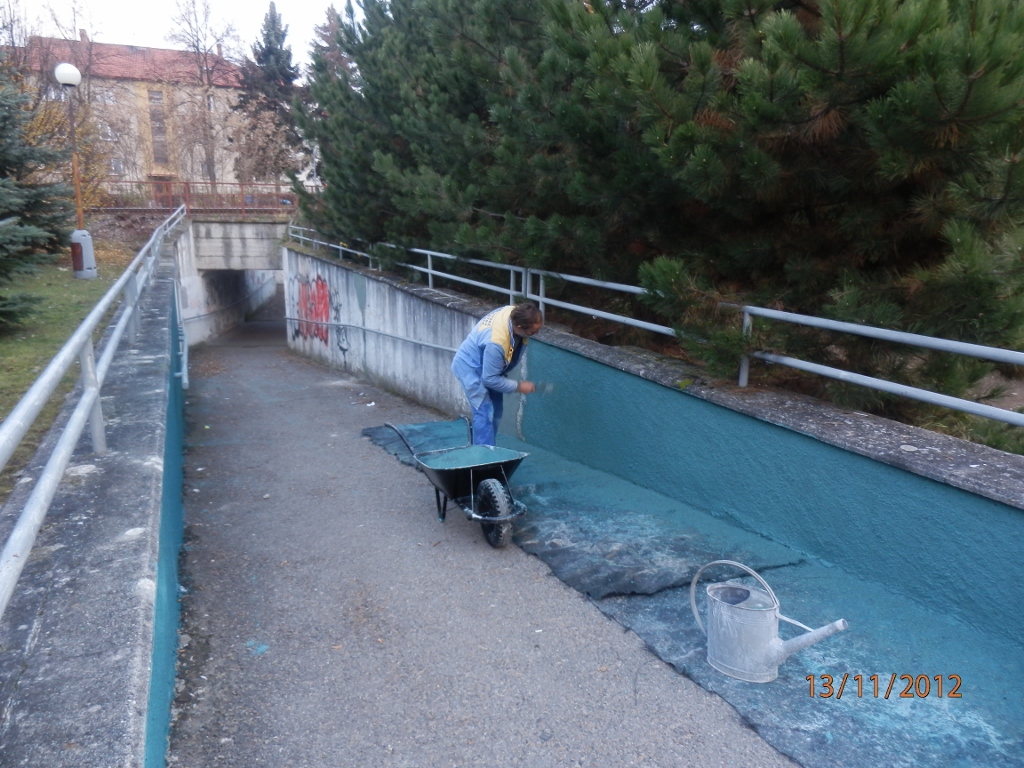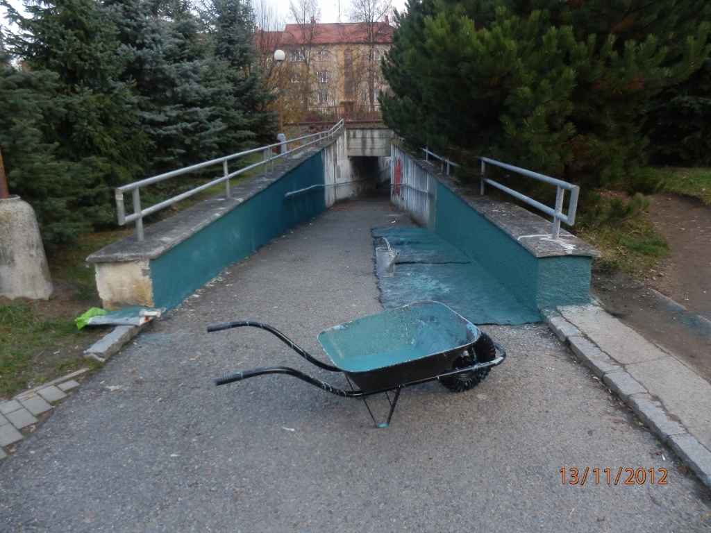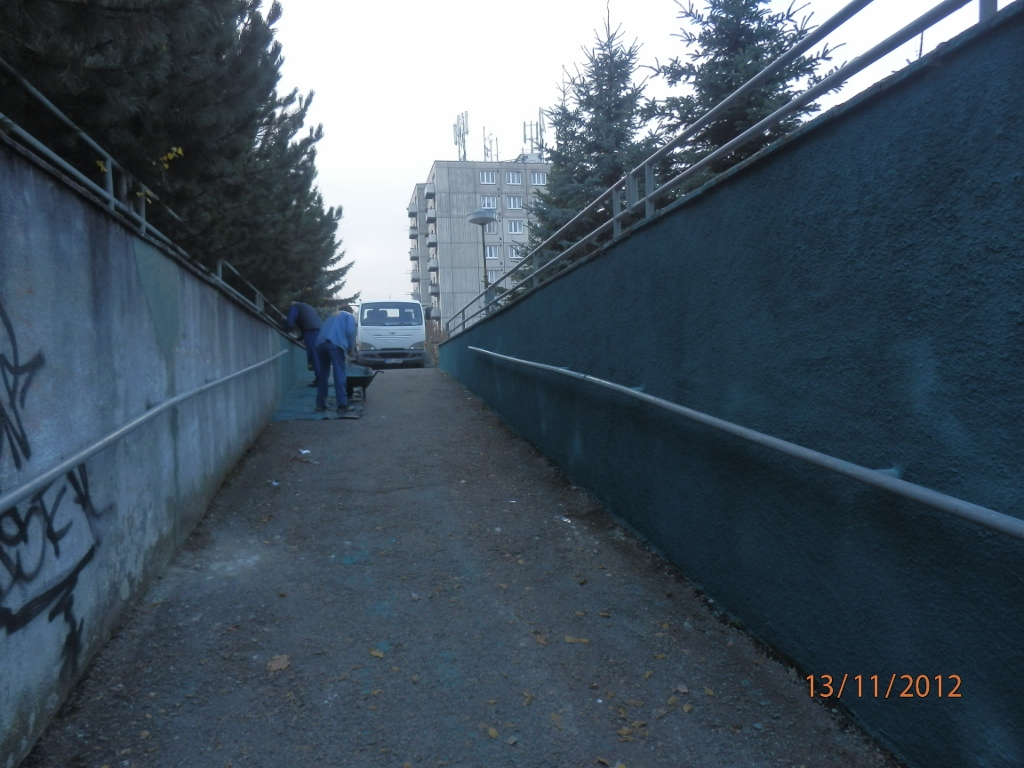 Dále byla zahájena částečná oprava omítky v průchodu z Palackého sadů do ulice Heydukova. Místa, která jsou poškozena vlhkostí, budou lokálně očištěna a následně opravena včetně nátěru bílou barvou. Práce budou taktéž dokončeny do 20.11.2012.