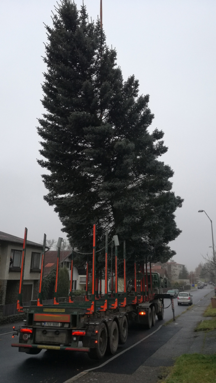 Na Velké náměstí v Písku byl dovezen 12m vysoký stříbrný smrk...